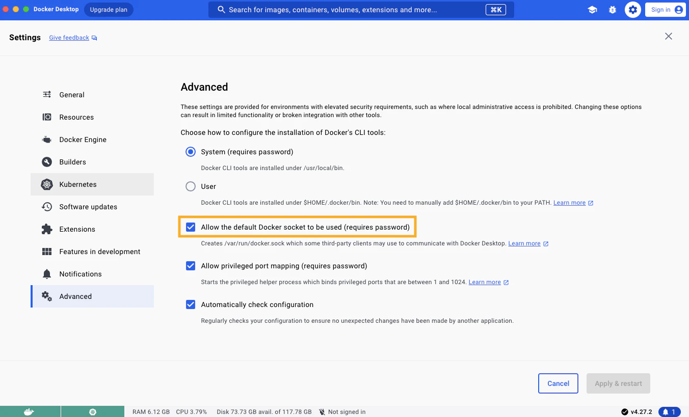 Allow the default Docker sockets to be used (requires password) is enabled in Docker Settings -> Advanced.