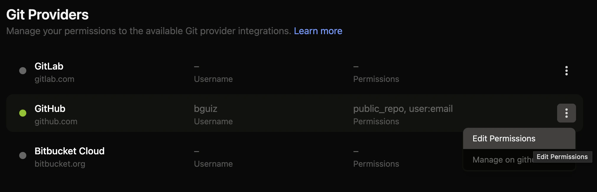 Enablepublic_repo permission for GitHub provider on Gitpod’s Git integrations page.